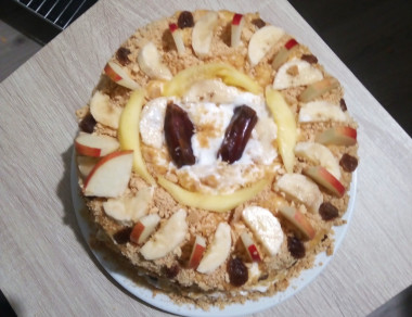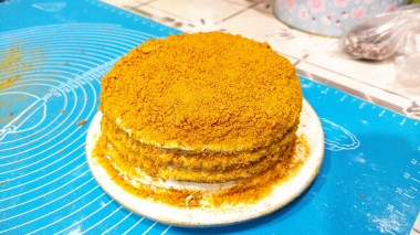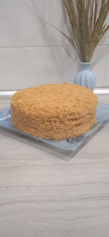 Готовый торт со всех сторон тщательно обсыпьте крошкой. Отправьте его в холодильник минимум на два часа (а лучше часов на 5-6) для пропитки.