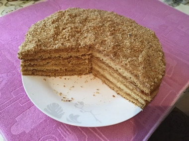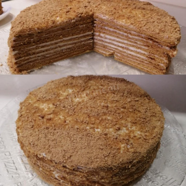 Ваш рецепт заитересовал меня своей технологией приготовления. Сделала все по рецепту. Правда сметану брала 20% и в крем добавляла на четверть меньше сахара, т.к. мои предпочитают менее сладкий крем. Получился тортик из 8-ми коржей диаметром 21 см, высотой 6,5 см. Торт очень нежный, воздушный, ароматный (аромат меда и карамели) - очень вкусный!. Я в восторге от полученного результата! Спасибо за рецепт.