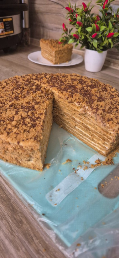 За рецепт Медовый торт со сметанным кремом классический спасибо. Готовила по этому рецепту, очень понравился. Ингредиентов взяла на 1,5 порции, не жалея сметанного крема между слоями, украсила верх кремом "Пломбир". В итоге вышел большой на 3 кг., для большой компании.
