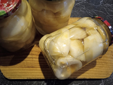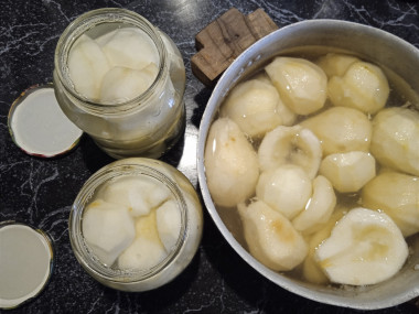 Очень люблю груши, а консервированные грушки зимой это просто сказка! Понравился мне рецепт груши на зиму без стерилизации компот. Решила сделать полезную заготовку по этому рецепту. Только я груши почистила от кожуры и вынула серединку, так как будет кушать ещё и ребенок. Использовала спелые и сочные груши. В банку клала половинок груш побольше, мы их очень любим. А сироп можно будет немного разбавить и получится компот. Лимонный сок заменила лимонной кислотой. Из ароматизаторов ничего не клала. Груши залила кипятком, оставила на 15 минут, слила воду, добавила сахар и лимонную кислоту, закипятила. Горячий сироп разлила в банки и закатала. Очень простой, быстрый и лёгкий рецепт заготовки груш на зиму.
