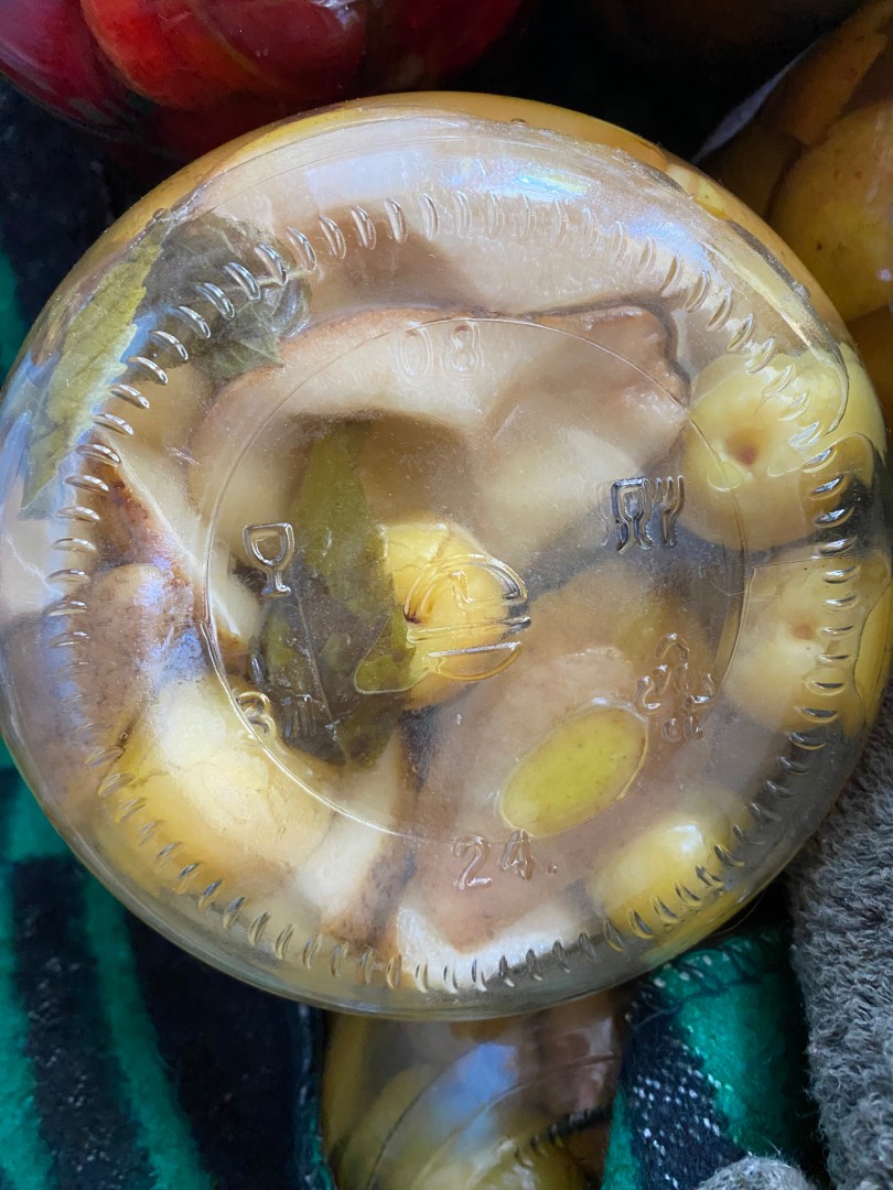 А я попробовала добавить в компот из целых груш еще и японскую айву. Целую, конечно, потому что даже отрезать хвостик в ней трудно. Вон, на фото, видите, какие желтенькие! Жду, что получится!