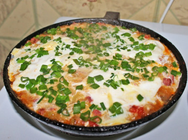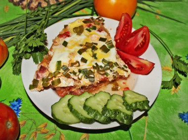 Сверху добавьте нарезанный зеленый лук или другую зелень.Накройте крышкой и готовьте 2-5 минут до готовности яйца. Яичница готова. Можно её подавать к столу. Приятного аппетита!