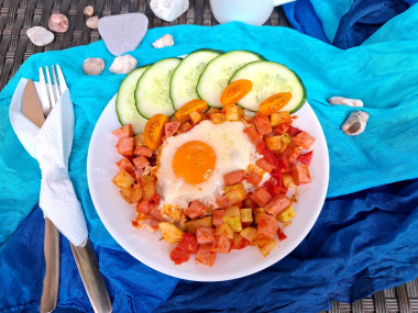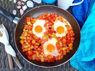 Даже на отдыхе в условиях съемной квартиры я смогла приготовить прекрасный завтрак. Яичница с кабачками помидорами и колбасой на сковороде - это вкусное и сытное блюдо, которое заряжает энергией надолго!