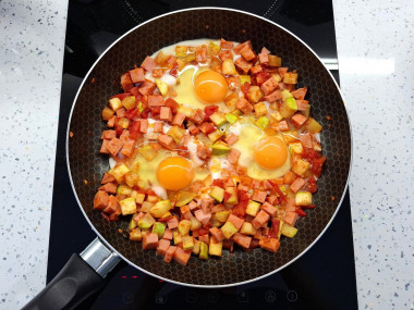 В колбасно - овощной поджарке сделала отверстия и вбила в них яйца, белки слегка подсолила. Готовила на минимальном нагреве до тех пор, пока белки не схватились. Желтки оставила жидкими. В них очень вкусно макать кусочки свежего хлеба. Если бы у меня были под рукой специи, добавила бы щепотку карри и паприку. Но и без них получилось очень вкусно и ароматно!
