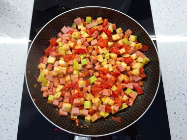 Разогрейте сковороду, налейте на нее растительное масло и слегка обжарьте на нем ветчину. Добавьте помидоры, перемешайте и тушите около 2 минут. С выбором сковороды и масла для жарки помогут статьи по ссылкам в конце рецепта.