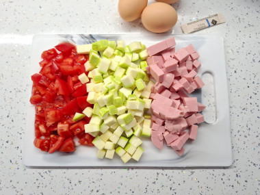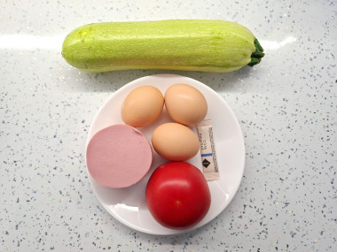 Как пожарить яичницу с кабачками помидорами и колбасой на сковороде? Подготовьте все необходимые ингредиенты. Ветчину можно заменить на колбасу или бекон. Зелены лук можно заменить на любую другую зелень по вкусу.