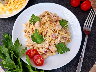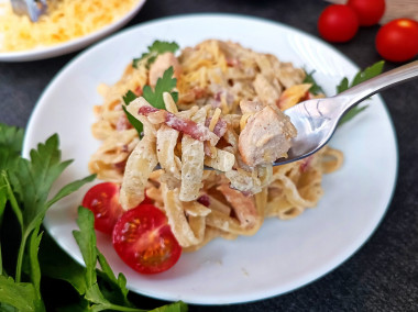 Пока варилась лапша, соус превратился в нежнейший кремовый соус. Блюдо получилось очень вкусным: лапша, пропитавшись соусом, стала нежной, при этом сохранила свою упругость, курица осталась сочной, а бекон добавил пикантности.