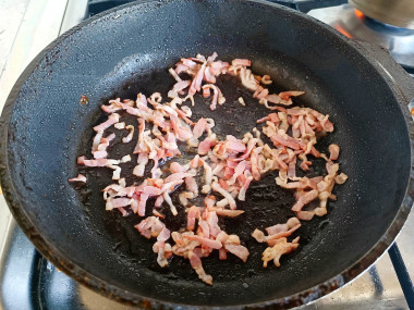 Пока куриное филе обжаривается, мелко нарежьте репчатый лук, бекон (или балык) и зубчик чеснока.