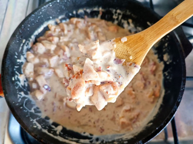 Готовила по рецепту: сначала обжарила куриную грудку, затем на той же сковороде — бекон с луком до золотистости и насыщенного аромата. Потом вернула курицу, добавила муку и сливки, а когда соус загустел, ввела натёртый сыр и зубчик чеснока.