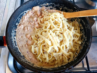 На сковороду в готовый сливочный соус с курицей переложите вареную аль денте пасту.