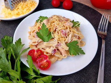Паста фетучини с курицей и грибами под сливочно-сырным соусом