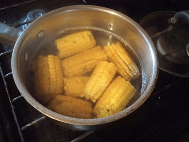Кукурузу отварите до мягкости, переложив початки в кипящую несоленую! воду. Время варки может значительно отличаться в зависимости от размера и степени зрелости початков. Я варила кукурузу около получаса на среднем огне. Ориентироваться стоит на мягкость зернышек. Не стесняйтесь, отрежьте одно зернышко и попробуйте его.