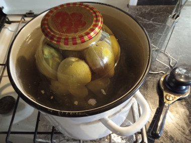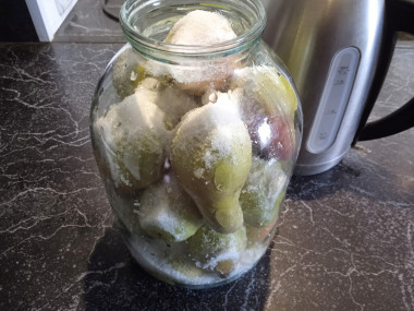 Замечательный рецепт груш меня поразил своей простотой! Обычно я груши закатываю очищенные дольками, на подготовку уходит много времени. А здесь сложил фрукты в банку, простерилизовал и готово. Решила и я таким образом закатать груши консервированные целиком в сиропе на зиму. Грушки у меня домашние сорта парижанка. Уложила их поплотнее в стерильную трёх литровую банку. Добавила сахар и лимонную кислоту по рецепту прям в банку и залила кипятком. Поставила в кастрюлю с горячей водой и стерилизовала 40-45 минут. Закатала и поставила в подвал после остывания. Элементарно и быстро!