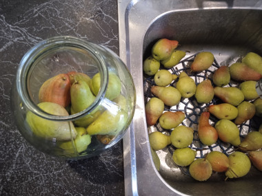 Как заготовить груши, консервированные целиком в сиропе, на зиму? Подготовьте ингредиенты. Груши вымойте и переберите. Выбирайте плоды с плотной мякотью без признаков порчи и гнили. Плодоножки у груш срежьте. Ингредиенты указаны из расчета на одну банку объемом 3 л. Банку промойте с содой и при желании простерилизуйте. О том, как это сделать, а также другую интересную информацию о консервации читайте в статье про заготовки по ссылке в конце рецепта.