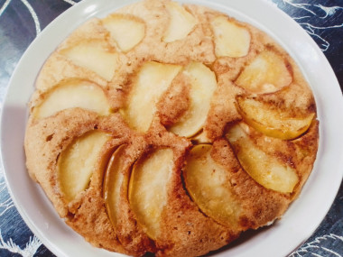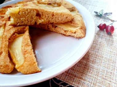 Получилась вкусная шарлотка. Тесто воздушное, мягкое, чувствуется что оно вобрало в себя сливочное масло, которым смазывалась сковорода.
