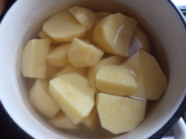 Картофель хорошо помойте щеткой под проточной водой, затем очистите овощечисткой — она снимает самый тонкий слой кожуры. Затем клубни промойте и сложите в кастрюлю большого объема. Если картошка крупная, то разрежьте ее на 3-4 части, мелкую оставьте как есть. Вскипятите в чайнике чистую воду, залейте ею картофель. Таким образом вы сократите время варки.