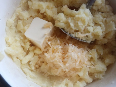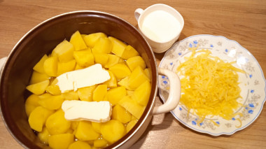 С готовой картошки слейте воду, затем хорошо разомните ее толкушкой. Всыпьте в кастрюлю сыр, выложите сливочное масло. Еще раз хорошенько помните пюре.