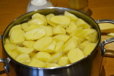 Поставьте кастрюлю на средний огонь, накройте крышкой. После того, как вода закипит, снимите пенку и всыпьте соль. Варите картофель 25-30 минут, в зависимости от сорта. Готовность проверьте ножом — лезвие должно легко протыкать кусочки.