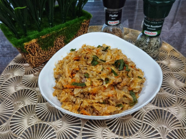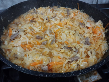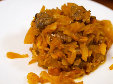 Приготовила вкусное, аппетитное блюдо: тушёную капусту с говядиной. Капуста получилась сочной,все ингредиенты отлично сочетаются друг с другом! Мясо нарезала небольшими брусочками,выложила на сковороду, слегка обжарила,добавила добавила немного воды, протушила. Затем лук, порезанный полукольцами и морковь,натёртую на тёрке. Капусту нашинковала, добавила к мясу и овощам, посолила, поперчила. Добавила томатный соус, воду и протушила до готовности, периодически помешивая.