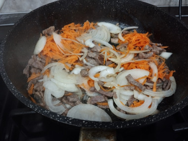 Добавьте к мясу лук и морковь. Тушите на медленно огне под крышкой около 10 минут до мягкости.