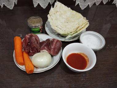 Как сделать тушеную капусту с говядиной в кастрюле? Для начала подготовьте необходимые ингредиенты по списку. Мясо можете брать любое: свинину, говядину, баранину, а также курицу или индейку. Часть туши тоже выбирайте по своему вкусу. У меня бескостная говяжья лопатка. Томатный соус в этом рецепте можно заменить на измельченные свежие помидоры или томатную пасту.