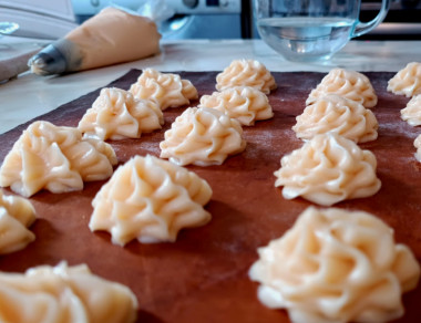 Анна, я недавно делала заварное печенье по похожему рецепту, только масла в тесте было больше, а муки - меньше. Правда, выкладывала тесто ложкой, и у меня получились не печеньки, а большие заварные пирожные. Пришлось срочно искать рецепт несложного заварного крема для их наполнения. Мне рецепт теста очень понравился и я его использовала в дальнейшем для приготовления заварных пирожных. Обязательно попробую Ваш вариант теста. Понравилось, что меньше в тесте сливочного масла. А результат у Вас на фото отличный))) когда сделаю, обязательно отчитаюсь