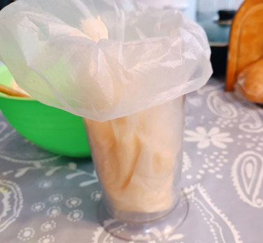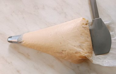 В кондитерский мешок, предварительно вложив внутрь насадку, выложила всё количество теста это удобно делать с помощью высокого стакана для блендера, вывернув края мешка.