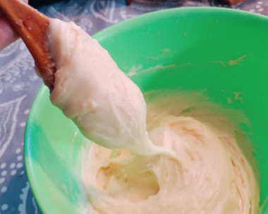 Готовое тесто должно быть гладким и стекать с лопатки лентой, образуя треугольник. Если тесто ещё крутое, возьмите четвёртое яйцо, разбейте его в миску, тщательно взболтайте вилкой, добавьте третью часть яйца к тесту, перемешайте, проверьте консистенцию. И при необходимости добавьте ещё третью часть яйца, перемешайте. Мне понадобилось три с половиной яйца.