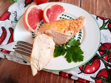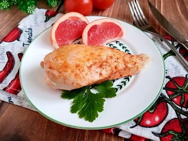 За 15 минут куриная грудка была готова. Обычно отвожу на это 25-30 минут. В этот раз грудка получилась намного сочнее! Даже объем кусочка больше обычного! Приготовленную таким образом грудку я использовала в качестве ингридиента для салата. Получилось вкусно!
