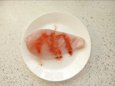 Пока закипала вода, я промыла грудку холодной водой, обсушила и посыпала паприкой. Решила еще добавить каплю растительного масла.