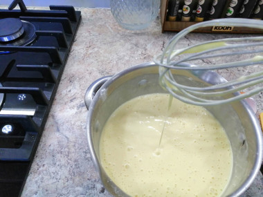 Для приготовления блинного теста соедините в глубокой чаше яйца с сахаром. Затем влейте немного растительного масла и молоко. Все смешайте с помощью венчика. Все тонкости приготовления удачных блинов вы узнаете из статьи в конце рецепта.