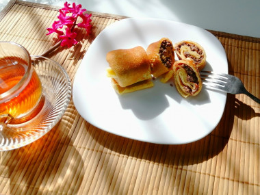 Фаршированные блины перед подачей на стол, подрумянила до хрустящей, золотистой корочки на предварительно разогретой сковороде с добавлением небольшого количества растительного масла.