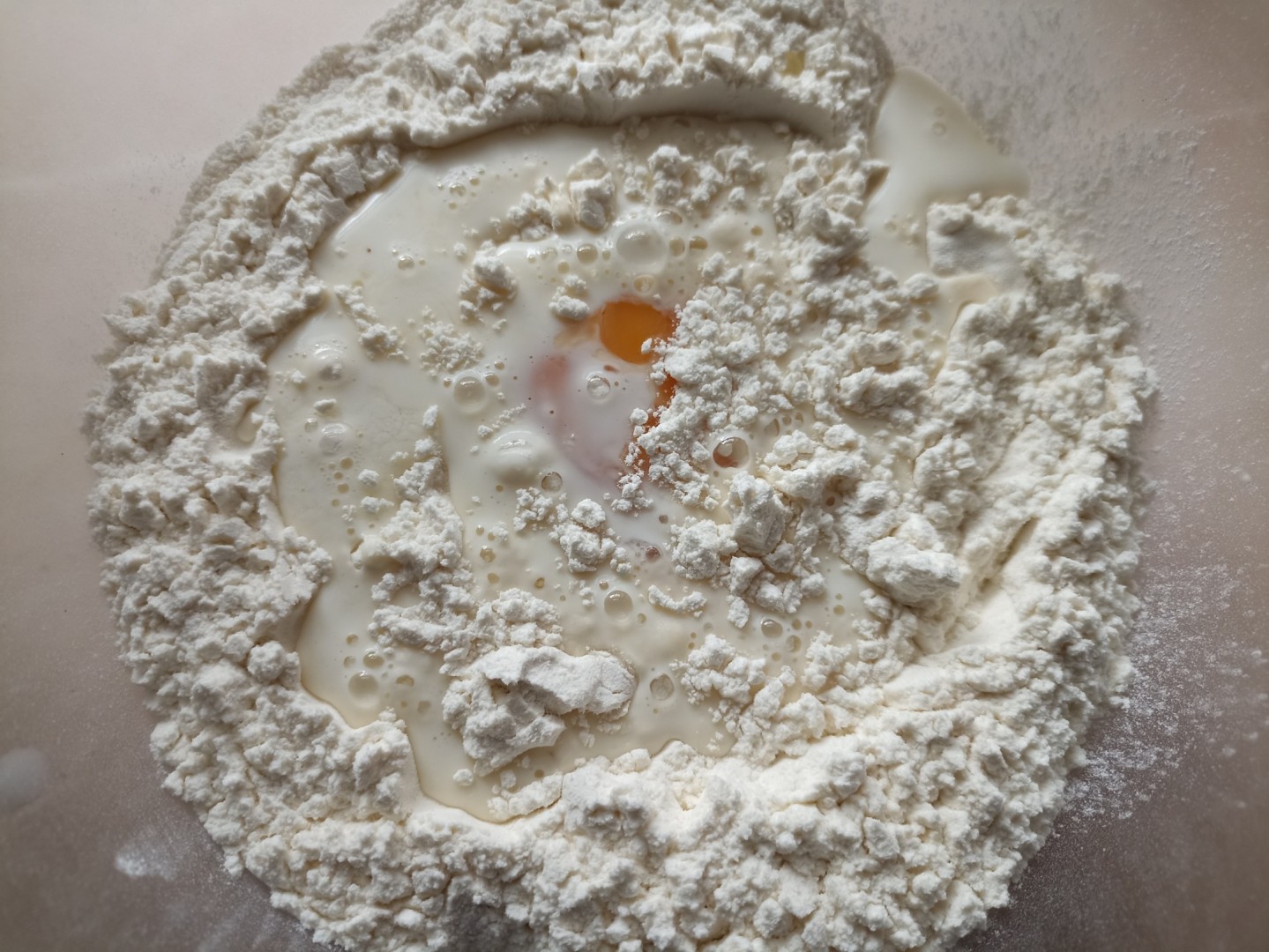 Всыпьте в миску муку, добавьте в нее соль, перемешайте. Вбейте сверху яйцо. Постепенно влейте в него теплое молоко. Вместо молока можно использовать воду. Когда размешивать вилкой будет уже неудобно, начните замес руками. Если тесто очень крутое, то влейте еще немного молока, если слишком липкое, то всыпьте муки. О свойствах муки читайте внизу под шагами.