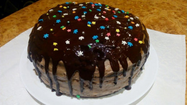 Выньте торт из холодильника и вылейте на его центр приготовленную глазурь. Лопаткой или шпателем аккуратно подталкивайте глазурь к краю, чтобы она начала стекать по бокам. Торт готов. Отправьте его в холодильник на пару часов. Глазурь должна застыть, а сам торт настояться.