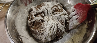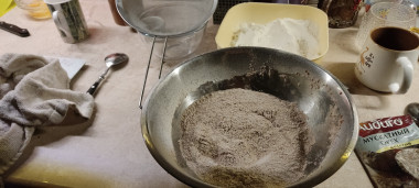А тем временем, в миску просейте и смешайте 150 г ржаной муки, 150 г пшеничной муки (оставшуюся пшеничную муку будем добавлять по мере надобности, т.к. мука может сильно отличаться по своим свойствам, которые влияют на консистенцию теста, подробнее о муке читайте в статье по ссылке в конце рецепта), весь какао-порошок и соду.