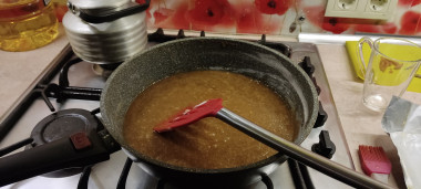 На среднем огне, помешивая, уваривайте карамель в течение 3-4 минут.