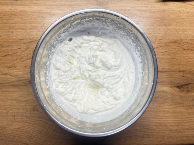 Взбейте сливки миксером до получения пышной воздушной нежной массы. Важно не перебить сливки, иначе они расслоятся и из них отделится масло. В правильно взбитых сливках след от венчика должен оставаться и не затягиваться либо затягиваться очень медленно. О том, как правильно взбивать сливки, читайте в статье под шагами.