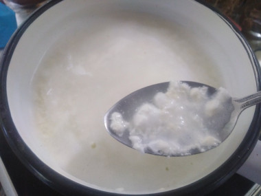 Скисшее молоко вылейте в подходящую по размеру кастрюлю. Лучше, если она будет эмалированной. Поставьте кастрюлю с простоквашей на плиту, на слабый огонь. Подогревайте кислое молоко, но не доводите его до кипения, иначе творог получится жесткий.