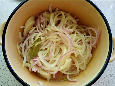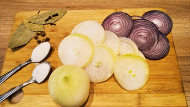 Советую использовать лук среднего размера, и чтобы все луковицы были примерно одинаковыми, чтобы не попадались и большие, и маленькие, и средние (смотрится более эстетично одинаковая нарезка). В первую очередь очистите весь лук от шелухи, после чего нарежьте, разрезав в начале каждую луковицу напополам, после чего нарезайте половинки луковиц нетолстыми полукольцами. Эта нарезка не принципиальная, но самая удобная и красивая.