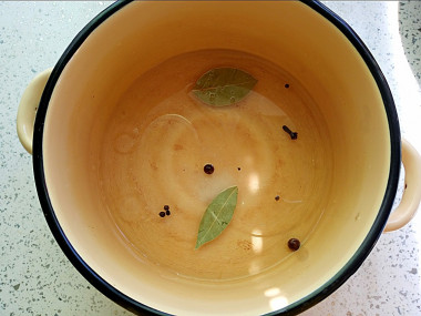 Возьмите кастрюльку среднего размера и влейте в нее весь объем воды. В кастрюлю с водой также сразу всыпьте сахарный песок и соль, добавьте перец горошком, лавровые листочки и гвоздику.