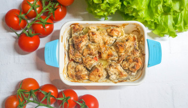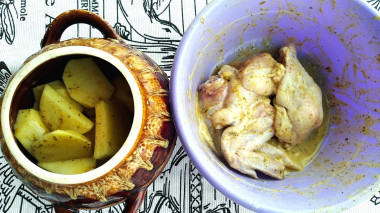 Сверху по картофелю выложите подготовленную маринованную курочку. Поставьте форму в духовку, предварительно разогретую до 200 градусов, на 1 час. По времени запекания ориентируйтесь по своей духовке.