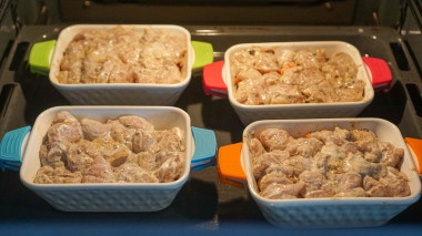 При помощи калькулятора уменьшила количество порций до 4-х. Подготовила необходимые ингредиенты, нарезала картофель ломтиками, курицу - кубиками. В отдельных мисках смешала курицу со сметаной и специями, и отдельно картофель со специями и сметаной. Выложила картофель с курицей в подготовленные формочки слоями, первым слоем - картофель, верхним слоем - курочку. Выпекала по рекомендациям из рецепта - на 200 градусах в течении часа, этого времени для приготовления в моей духовке оказалось достаточно, уже по истечении 40-45 минут по моей кухне раздавались вкуснейший аппетитные запахи!