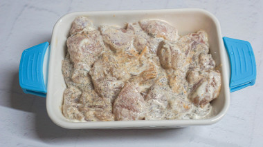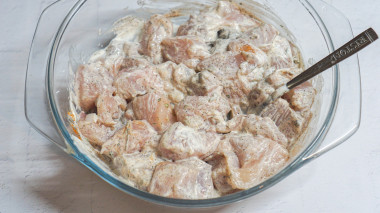 Выложите в чашу подготовленные куриные кусочки и все перемешайте. Оставьте курочку постоять на 30-60 минут при комнатной температуре. Этого времени хватит, чтобы курица немного промариновалась.