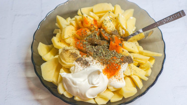 Очищенный картофель нарежьте крупными кусочками и выложите в чашу к сметане. Хорошо перемешайте, чтобы картофель был равномерно покрыт сметаной со всех сторон. Если вы боитесь, что картофель не пропечется, то предварительно можете проварить его в кипящей воде 1-2 минуты, после чего откиньте на дуршлаг, чтобы стекла лишняя вода.