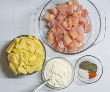 Как запечь курицу с картошкой в сметане в духовке? Подготовьте продукты. Важно выбрать картофель для запекания, с высоким содержанием крахмал. Картофель с низким содержанием крахмала может не пропечься и остаться сырым. Подробнее об этом читайте в конце рецепта. Картофель очистите от кожуры и ополосните в проточной воде от загрязнений. Если курица заморожена, то её необходимо заранее разморозить. Сметана подойдет любой жирности.