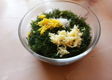 Укроп мелко порежьте и положите в миску. Чеснок очистите, измельчите и добавьте в миску с укропом.