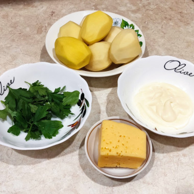 Картофель трём на крупной тёрке, отжимаем сок. Немного солим, перчим. Смешиваем со смесью сыра, яйца и майонеза.