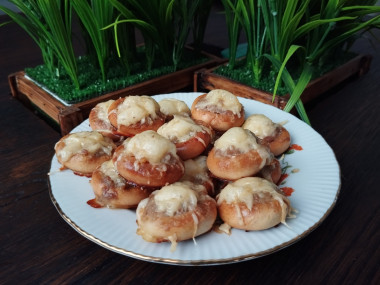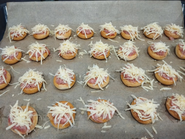 Противень я застелила кулинарным силиконовым ковриком для запекания. Если такого коврика у вас нет, можно просто противень смазать рафинированным растительным маслом. Разложите бублики на некотором расстоянии друг от друга. В серединку примерно по чайной ложке уложите фарш. Сверху выложите тертый сыр. Отправьте противень в предварительно разогретую до 180 градусов духовку. Выпекайте примерно 25-30 минут, пока начинка не пропечется.