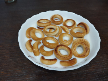 Бублики выложите в глубокую емкость и залейте теплым молоком, но не гарячим, иначе сушки могут превратиться в кашу. Оставьте их примерно на 10-15 минут (время зависит от размера и толщины изделий). Бублики должны стать мягче. Важно следить, чтобы они сохранили свою форму и не расползлись. Переворачивайте время от времени бублики, чтобы они размочились одинаково со всех сторон. После чего выложите их на бумажные полотенца, чтобы стекло все лишнее молоко.