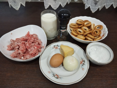 Замочила бублики в молоке и оставила на 10 минут. В фарш добавила мелко порезанный лук, соль,перец, яйцо и перемешала. Сыр натерла на мелкой тёрке. Готовый фарш разложила по бубликам,сверху выложила сыр и отправила с духовой шкаф запекаться при 180° 25 минут.